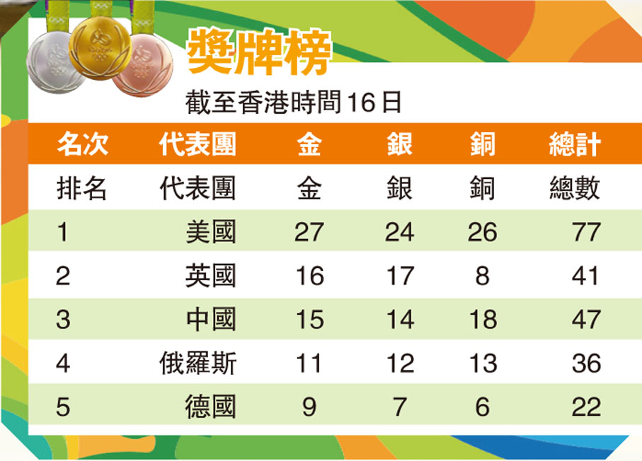 獎牌榜(截至香港時間16日)