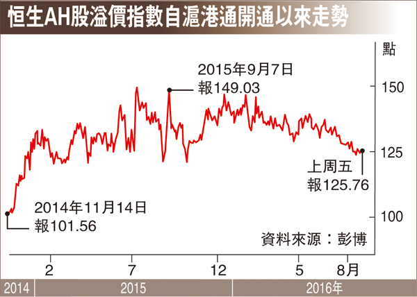 從宏觀角度看,金融資產定價能力是金融市場的核心功能之一,也是國家最重要的軟實力。長期以來,由於內地金融市場與資本項目並未完全與世界接軌,內地在國際金融市場上總體屬於跟價方(Price-taker),而不是定價方(Price-maker)。最經典亦是曾經反覆為人詬病的,是所謂A-H股的差價(附圖)。市場的隔離,造成同股不同價的怪狀。特別是五大國有銀行海外上市,到底是改制成功還是國資賤賣,社會輿論莫衷一是。這些現象,歸根結底是我們的市場沒有國際公認的定價能力。進一步,在經濟全球化、地緣政治右傾化、保護主義抬頭的時代,金融資產定價能力更是確保國家安全的重要手段。