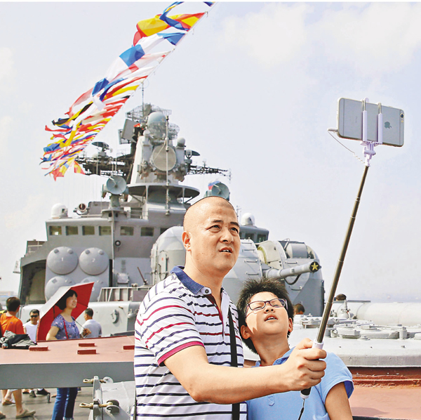 廣東湛江市民昨日參觀參加中俄「海上聯合-2016」軍事演習的雙方艦船。圖為市民在俄方艦船上自拍留影。 中新社