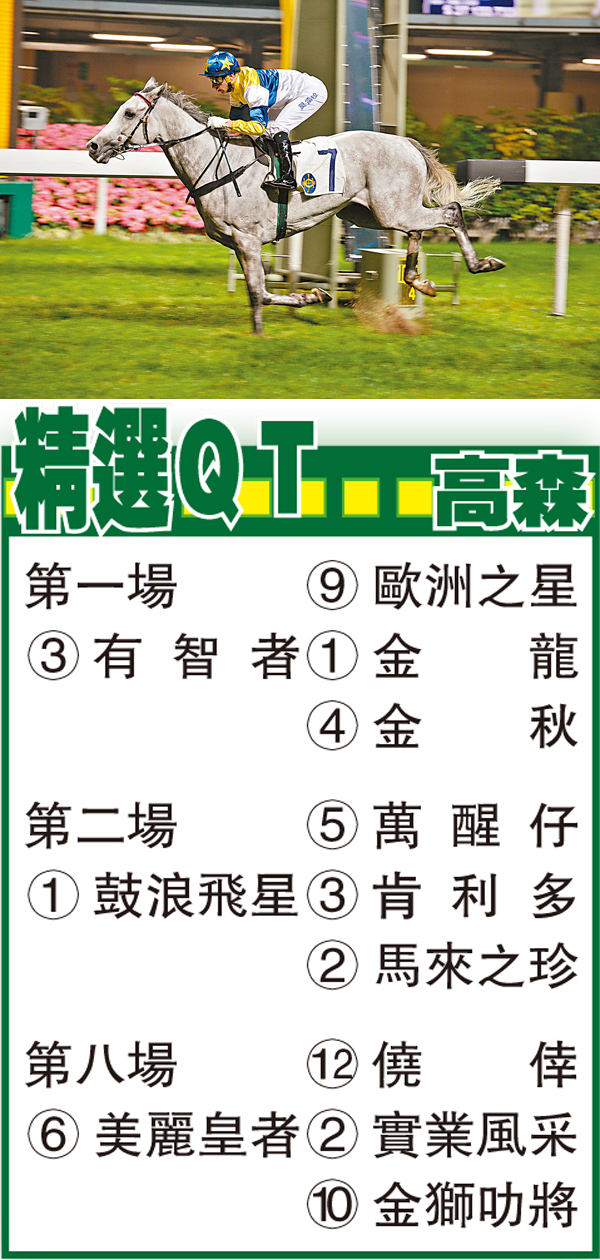 第一場、第四班、一八○○米。「有智者」去季取得三捷省靚招牌,由五班贏至四班,看季初試谷閘走勢依然搶眼,料可承接三W銳勢繼續爭取好成績。「金龍」剛戰田草千六米末段早已望空,惟只保持均速得殿軍,或許以現時腳法向長途發展效果會更佳,三甲應有一席。