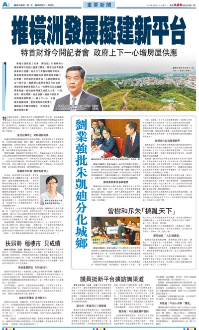 香港文匯報訊(記者 鄭治祖)針對橫洲公屋發展項目引起社會廣泛關注,特區行政長官梁振英昨日透露,他今日下午會和財政司司長、發展局署理局長和運輸及房屋局局長等舉行記者會,交代橫洲發展項目,又表明願意建立一個平台,邀請關心橫洲發展及可以協助推動計劃盡快落實的人士,包括候任立法會議員朱凱Y、棕地的使用者及地區人士等,一起協商、解決問題。他並強調,整個特區政府在房屋供應問題上一直上下一心,令樓價由高峰回落,更希望能夠在社會上調動最大力量和積極性,共同完成橫洲發展計劃。
