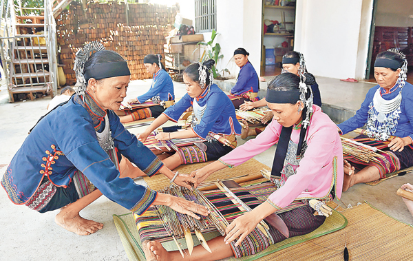1958年出生於海南省保亭黎族苗族自治縣加茂鎮加茂村的胡春芳(左一),9歲隨長輩學習黎族織錦技藝。多年來,她登門拜訪老藝人,不斷探索與研究黎錦的技藝和創新,現為海南省級非物質文化遺產黎族傳統紡染織繡技藝代表性傳承人。 ■圖/文 新華社