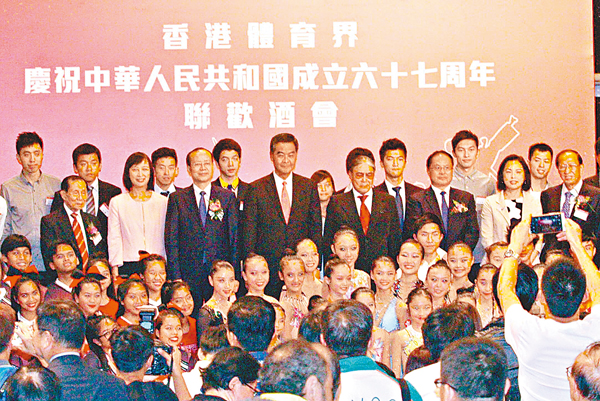 ■特首梁振英昨晚在出席香港體育界慶祝國慶酒會時提及啟德體育園,他表示會聽取立法會議員馬逢國的建議,開放校園的運動設施予市民使用,以拓展社區運動設施。 潘志南 攝