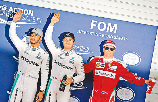 F1日本站昨日進行排位賽,平治車隊的羅斯保(中)以0.013秒的優勢,力壓隊友咸美頓拿到今日舉行的正賽桿位。(now671台今日12:30p.m.直播) 法新社
