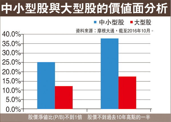 李宏正進一步指出,目前中小型股仍有25.2%的個股股價淨值比(P/B)不到1倍,相較於大型股僅有12.2%;此外,中小型股仍有37.8%之個股股價不到過去10年高點的一半,而大型股僅17.3%,如此看來,中小型股頗具價值面的優勢。