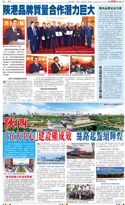 陝港品牌建設與質量合作交流會10月17日在港舉行,拉開了第六屆陝粵港澳經濟合作活動周的序幕。會上,陝西省質量技術監督局局長喬軍與香港品質保證局總裁林寶興簽署了《陝港品牌與質量合作備忘錄》。陝西省政府副秘書長張小寧、香港品質保證局主席盧偉國、陝西省貿促會會長薛華等出席會議。陝西省委宣傳部副部長李偉主持會議。