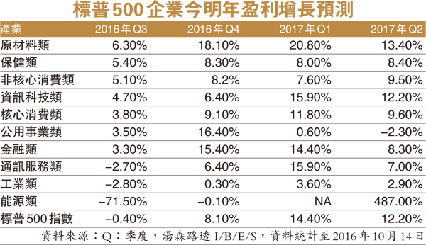 日盛全球抗暖化基金經理人鄭慧文表示,根據湯森路透報告預測,第三季度的盈利預計按年下降0.4%,過往預測數據顯示美股企業財報優於預期幾率高,第二季市場預期標普500企業淨利按年將倒退6.2%,但實際倒退幅度約為3%;目前市場預期第四季標普500企業盈利按年將倒退約2%,具過往經驗推估,第四季標普500企業淨利按年有機會由負轉正。