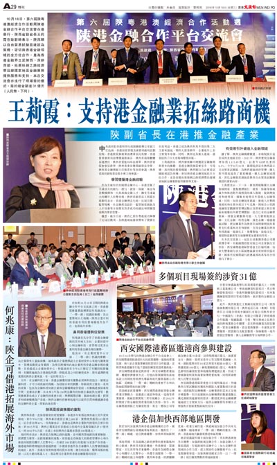 10月18日,第六屆陝粵港澳經濟合作活動周陝港金融合作平台交流會在港舉行。陝西省副省長王莉霞在致辭時表示,陝西願以自由貿易試驗區建設為契機,密切與香港金融領域的全方位合作,並為香港金融界立足陝西、深耕西部、拓展絲綢之路經濟帶沿線國家地區金融業務提供服務和支持。本次交流會亦進行了現場簽約儀式,簽約總金額達31億元(人民幣,下同)。