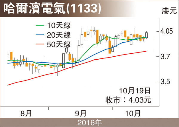 港股續維持日升日跌的「單跳」走勢,昨埋單計數跌89點,收報23,305點,相比周二勁彈356點,可算是典型的大漲小回。港股近日反反覆覆,觀乎炒股唔炒市仍為市場特色。事實上,電力設備股便榮辱互見,其中東方電氣(1072)和上海電氣(2727)均告偏軟,反觀哈爾濱電氣(1133)卻逆市呈強,曾高見4.05元,收報4.03元,仍升0.1元或2.55%,現價已企於10天、20天及50天等多條重要平均線之上,而平均線組合排列亦告呈強。