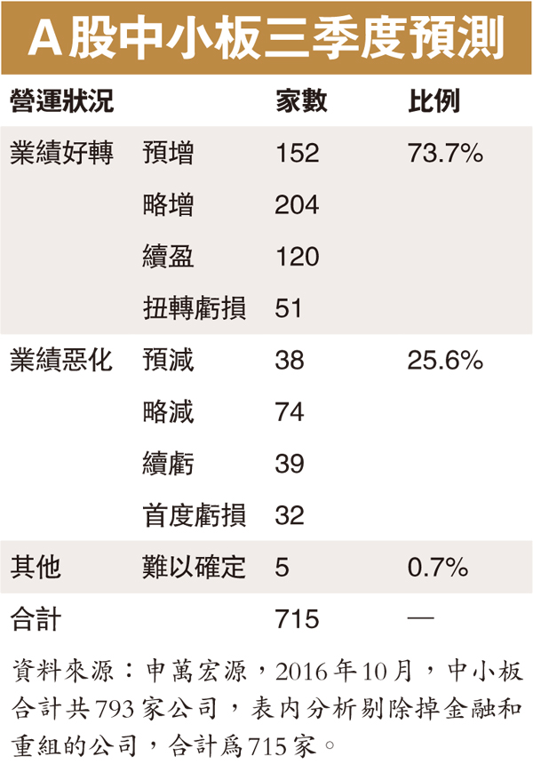 中小型A股第三季財報陸續揭曉,以中小板成分股來說,第三季整體盈利較上半年改善明顯,淨利潤較去年同期增長了43.37%。分析師指出,除了績優增長股以外,第三季財報業績扭轉虧損的企業,都將是投資人關注焦點,建議投資人可伺機分批進場中小型A股基金,掌握其業績的增長爆發力。