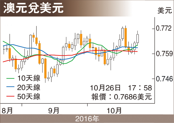另一方面,澳洲統計局本周三公佈第3季消費者物價指數按年上升1.3%,高於第2季的1%升幅,而第3季的消費者物價指數按季則攀升0.7%,顯著高於第2季的0.4%升幅之外,更是去年第2季以來最大的按季升幅。雖然澳洲通脹率現階段仍顯著低於澳洲央行的2%至3%通脹目標,但原油價格近期高位徘徊,將令澳洲通脹率有逐漸觸底回升的傾向,預期澳洲央行下周二會議將維持貨幣政策不變。若果澳洲央行會議後的聲明內容一旦偏向中性,降低澳元往後減息機會,則不排除澳元升幅將擴大至78美仙水平。預料澳元將反覆走高至78.30美仙水平。
