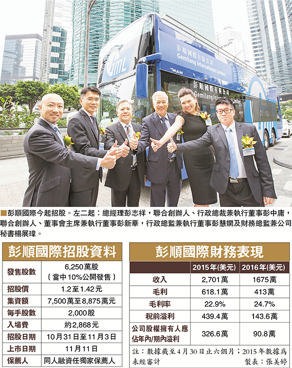 香港文匯報訊(記者 張美婷)馬來西亞及新加坡車身製造商及巴士裝配商彭順國際 (6163) 將於今天起招股,集資最多8,875萬元,每股作價介乎1.2至1.42元,每手2,000股,入場費約2,868元,預計11月11日正式掛牌。彭順國際聯合創辦人、行政總裁兼執行董事彭中庸昨天於記者會表示,公司最終目標是打進內地市場,冀透過香港達成終極目標。