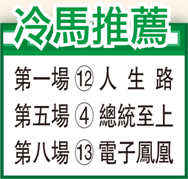 第八場、第三班、一六五○米。「電子鳳凰」拍賣馬雖然在港只贏過一場頭馬,但該役賽事水準可說含金量十足,事關蹄下敗將分別是「經典帝國」及「錶之勝」等其後可征服三班之馬,可見「電子鳳凰」現評六十分必佔一定優勢。查此駒原本可以報跑四班千八米,但馬房寧願安排以下犯上,出戰三班賽可見有一定信心,而且至今泥地三戰全入Q,有力打開今季勝門。
