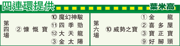 第六場、第四班、一八○○米。胡森泥地馬寶藏「威勢之寶」,在胡森訓練下獲冠亞季軍各二均全跑泥地錄得,上季初評六十三分居三班連跑三仗乏作為,遂降落第四班,但跑了十仗均一無是處,最後一役減到四十分角逐泥地一哩,縱排十二檔起步及出閘包尾第二,仍施展強橫後勁以半馬位之先力挫「鑽之友」掄元,末段並造出廿三秒三三全場最快時間,贏馬姿態相當誇張。「威勢之寶」現評四十六分仍大佔優勢,暑後加盟呂健威馬房操得磨得,上次季內初出泥地一哩車前倒後跑得第四名,狀態已復甦,近課快試火氣旺盛,今次加程跑千八米料橫行無忌。