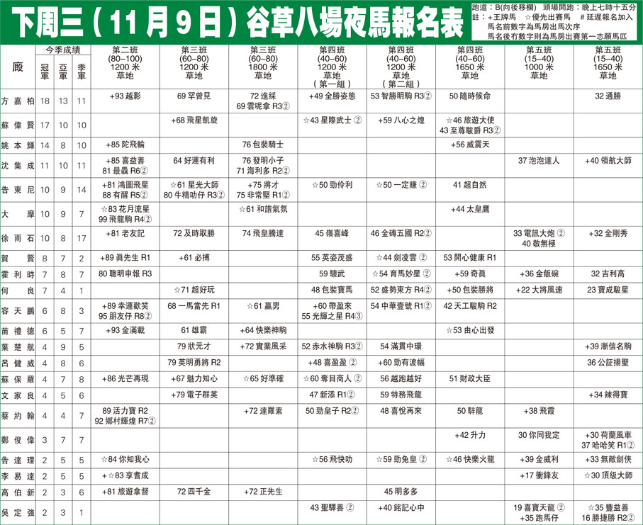 下周三(11月9日)谷草八場夜馬報名表