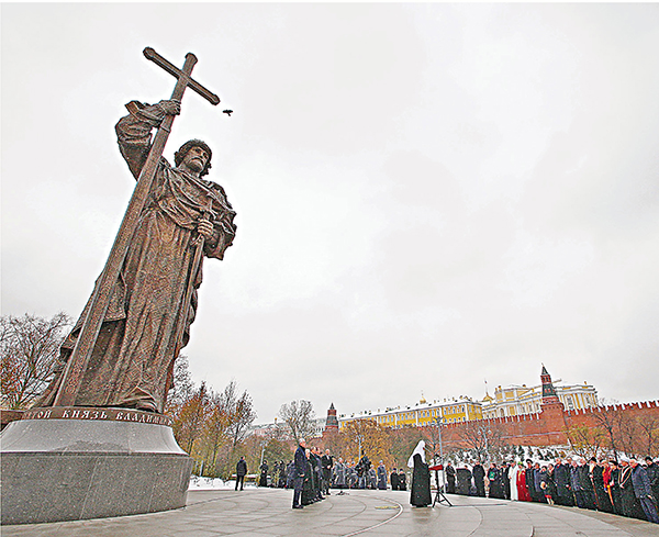 俄羅斯總統普京在昨日民族統一日,為克里姆林宮外新豎立的17米高弗拉基米爾一世銅像揭幕。弗拉基米爾一世是基輔羅斯(今俄羅斯、烏克蘭及白俄羅斯前身)大公,988年帶領國家改信傳自東羅馬帝國的基督教(東正教前身),普京讚揚他是有遠見的政治家,統一及維護俄國領土,又呼籲民眾繼承弗拉基米爾一世的精神遺產,團結一致對抗「現代挑戰」。