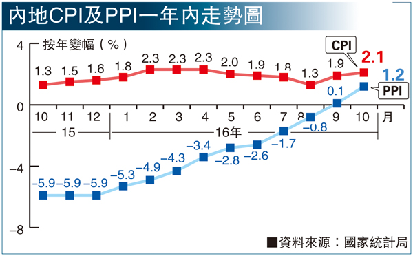 香港文匯報訊(記者 海巖 北京報道)在9月份工業生產者出廠價格指數(PPI)實現四年半以來首次轉正後,煤炭等能源價格大漲帶動10月PPI同比漲幅超預期擴大至1.2%,漲幅比9月擴大1.1個百分點。