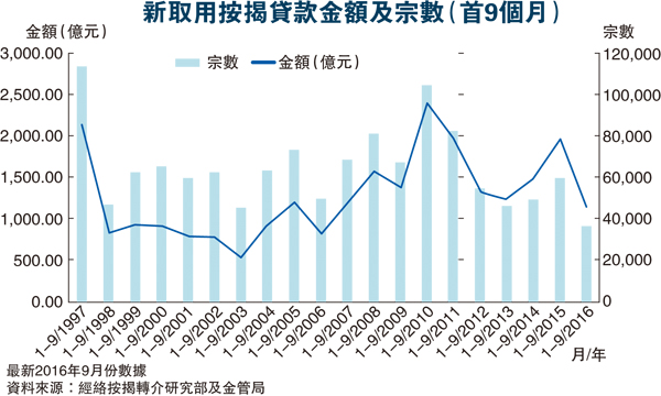綜合金管局及經絡數據,今年首9個月新取用按揭貸款金為1,150億元,較去年同期跌41.4%。至於新取用按揭貸款宗數今年累計36,067宗,較去年同期下跌39.4%。