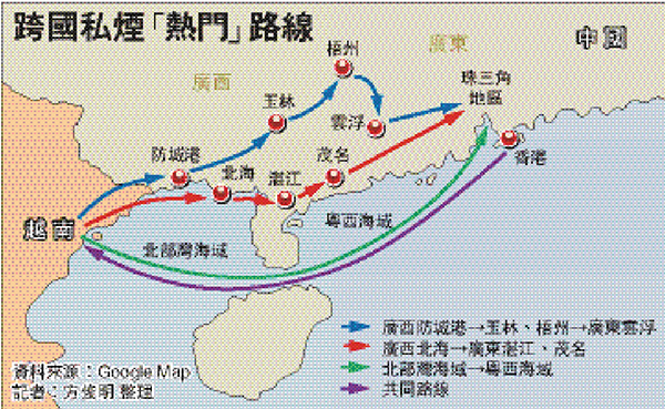 香港文匯報訊(記者 方俊明 廣州報道)不法分子走私煙草活動渠道更加多樣、隱蔽,已形成「境外訂貨、走私入境、集中囤積、跨區偷運」一條龍作業模式。記者昨日從廣東省海防打私辦獲悉,粵桂兩省區一同偵破「香港-越南-廣西-廣東」等走私鏈條大案,多條「走私」線路曝光:香港走私香煙經越南,通過中越邊境,途經廣西陸路,或北部灣海域水路,運往珠三角再分銷全國各地。