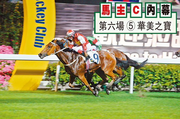 第六場、第三班、一六五○米。「華美之寶」(圖9號)東廄五歲仔跑慣谷草千二米,到前仗復出卻角逐田草千四米,用意分明志在熱身練氣;到上次回師最合腳法的谷草窄場,告仔唔揀千二卻刻意揀一哩增程,韋達沿途擺前走,入直路遇上多匹主要對手在衝刺時碰撞,本身得以突圍放到,今仗有力再次一放迄終。