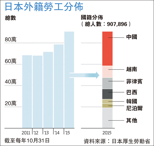 外籍勞工目前佔日本總勞動力少於2%,數字遠低於歐美國家。英國約11%勞動人口不持英國國籍,美國則有17%勞動人口在外國出生。日本政府在2012年開始,批准專業人士申請日本永久居留權,截至去年底,只審批了4,347宗申請。