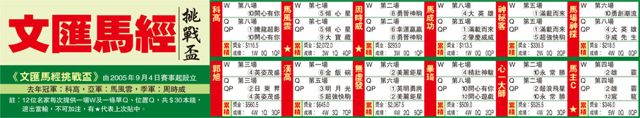 註:12位名家每次提供一場W及一條單Q、位置Q,共$30本錢,退出當輸,不可加注,有★代表上次貼中。