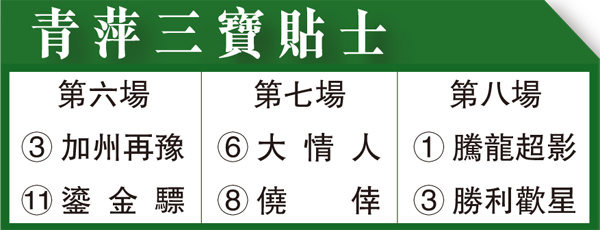 第六場、第三班、一六五○米。「加州再豫」四歲仔上季九戰取得兩冠一亞一季成績不俗,而今季評六十五分先後四戰田草一哩,初出配雷神即以十七蚊大熱贏馬得手,惟打後三戰只取一亞,予人感覺進度徘徊不前,而今次練者安排渡江轉戰一哩,沿用蔡明紹排六檔以均速跟前戰略競逐,隨時轉場出擊有意外驚喜。