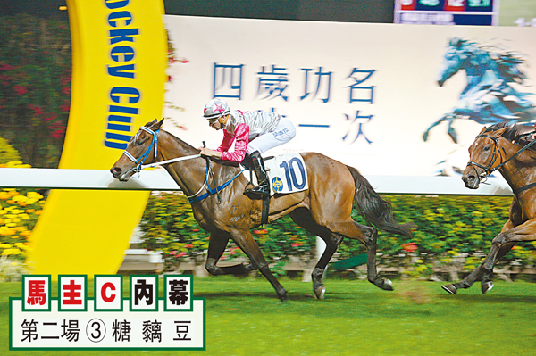 第二場、第五班、一八○○米。「糖黐豆」季內四戰中鶾p神胯下執兩W,可見人馬合拍,再看前仗在何澤堯胯下因應排十一檔關係,起步刻意在馬群之後切入,處境變得相當被動,然而直路衝刺力卻不弱跑第七;上仗復由雷神執韁,七檔出閘雖慢,惟落山取內欄慳位衝刺再建奇功,拚後加至三十六分仍戰五班此程,當有條件爭取季內第三場勝利。