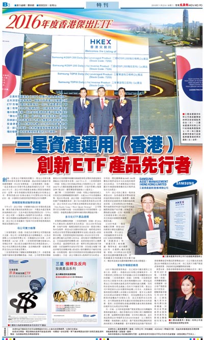 展望未來,香港市場將發展成為亞洲區內其中一個主要的ETF市場,三星資產運用(香港)亦將繼續緊貼市場脈搏,迎合客戶對投資的不同需求,積極開發多樣化的ETF產品,以捕捉龐大資本市場的潛在投資機遇,同時亦希望創新產品能保持香港作為區域金融樞紐的領先地位。