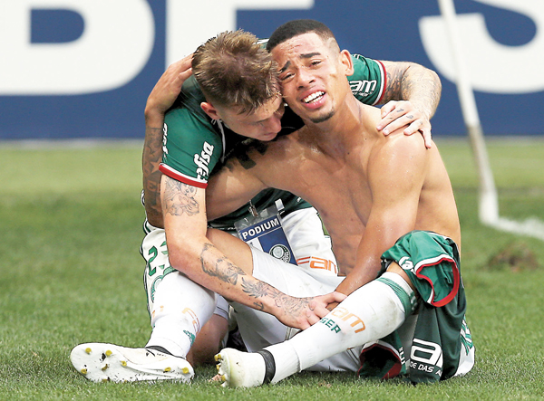 ■彭美拉斯昨天主場擊敗查比高恩斯1:0後終於一搔22年之癢,提前一輪鎖定巴西甲組足球聯賽冠軍,即將轉戰英超曼城的前鋒新星加比爾捷西斯(右)賽後一時感觸,哭成淚人。 路透社