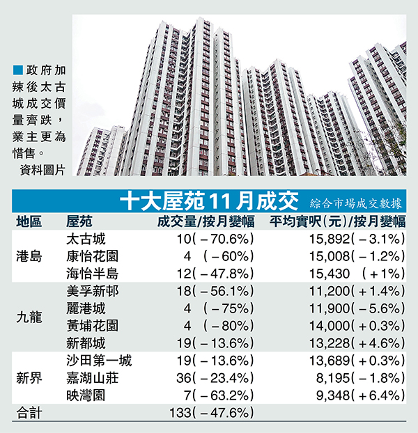 香港文匯報訊(記者 梁悅琴)港府加辣已屆一個月,二手樓市雪上加霜。中原地產十大屋苑11月錄得133宗成交,較上月254宗急跌47.6%,成交量為今年2月後的9個月新低。全線十個屋苑成交量一致下跌,幅度由13.6%至80%不等,實用呎價則有6個屋苑錄得上升。