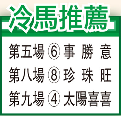 第五場、第四班、一六五○米。「事勝意」上季於孫達志倉表現平平,今季踏入五歲加盟苗禮德馬房,本身明顯進步加上評分降至低位,因此陣上漸見競爭力,季內兩戰谷草同程都得亞軍,令牠在此程上名率高達六成,屬首本強項。現時此駒的狀態已在勇境,是次再跑谷草一哩賽,發揮上一定更好,現時在四班作賽亦具一定競爭能力,屆時只要交出應有水準,當有機會在國際騎師錦標賽打開勝門。