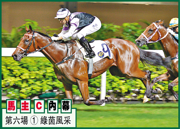 第六場、第四班、一二○○米。「綠茵風采」在港出賽兩季,兩勝均在谷草千二米獲得,今季初出由於未熱身,如果立即跑勝途,恐怕貫注力未足難以捱到尾,所以初出憑新鮮感縮程跑一千米,亦屬可取的選擇,該役配雷神喜獲一檔之利,結果力拚下僅負於超班馬「翩翩」無話可說,今回強敵已去,復爭千二勝途,爭勝機會樂觀。