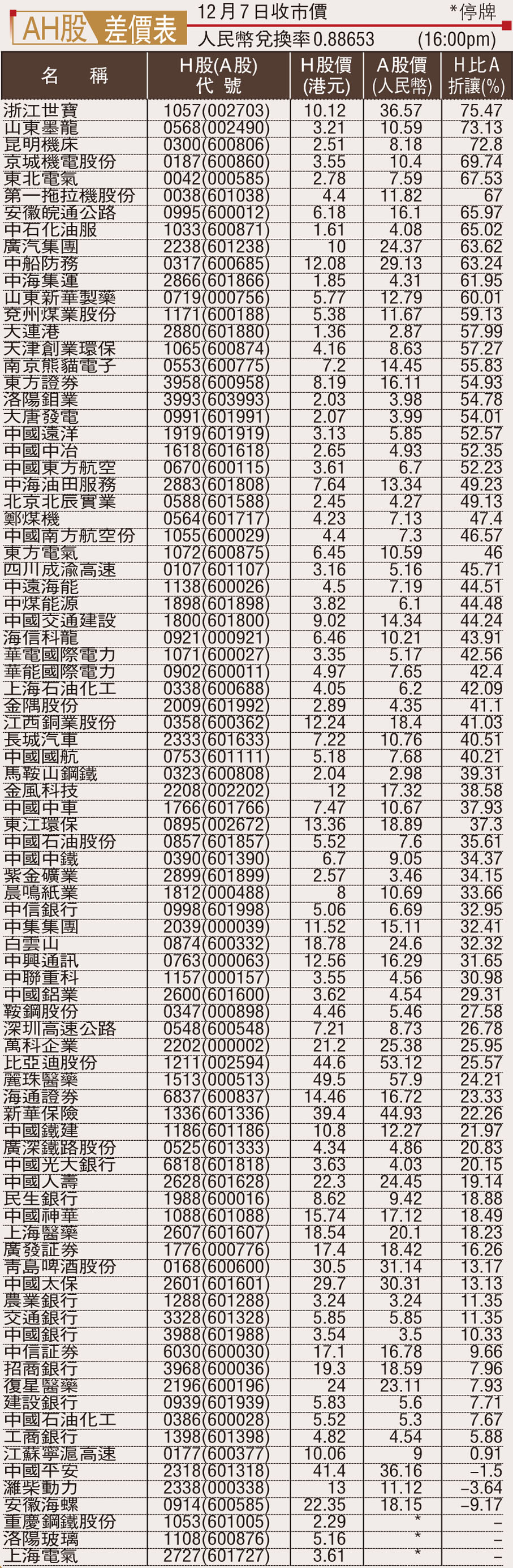 AH股差價表