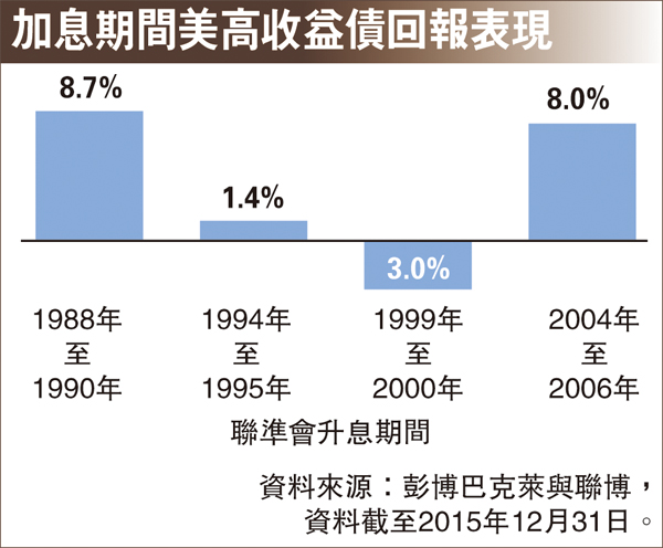 第二,加息期間仍有良好表現。根據1989年以來的資料顯示,在聯儲局緊縮貨幣政策的時期,除了2000年發生通訊產業信用危機之外,其他三次美國高收益表現均為正回報(見圖)。原因之一在於,高收益債與利率走向的連動性其實並不高,其表現主要還是取決於發行企業的營運基本面。由於聯儲局加息是反映景氣回暖,代表企業的盈利將增長、財務狀況愈加強健,可望降低債券的違約風險,對於許多高收益債發行企業往往是一大利好。