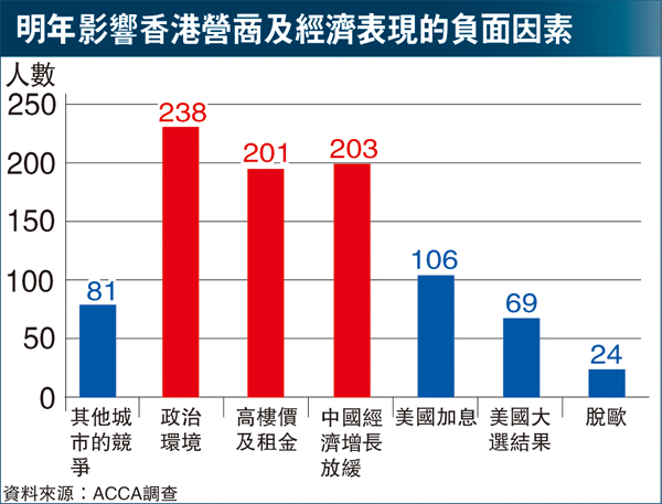 調查顯示,「政治環境」是為香港經濟帶來負面影響的主因,ACCA香港政策主管朱暖暉昨指出,任何地方若果政局不穩或政治分化,的確會對社會氣氛、經濟造成負面影響,但其對企業實際運作的衝擊並沒有如「環球經濟狀況」及「法規轉變」等顯著。她舉例解釋指,例如法規轉變,由於反洗黑錢有新規例,未來亦會有稅收自動資料交換(AEOI)、稅基侵蝕及利潤轉移(BEPS),將令企業的合規成本增加。