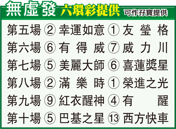 第六場「有得威」上場同程用潘頓姍姍來遲得第三,今次轉用雷神加強配搭決心破悶局,戰意鮮明值得俾機會。「威力川」今季四戰得一冠三亞,跑法夠主動,適應一班步速再來可挑戰任何對手。