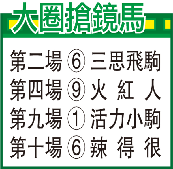 「三思飛駒」巫斯義試兩段,氣定神閒,馬身壯毛色深潤,朝氣勃勃,火氣又見冒升,埋門狀態極之吸引。