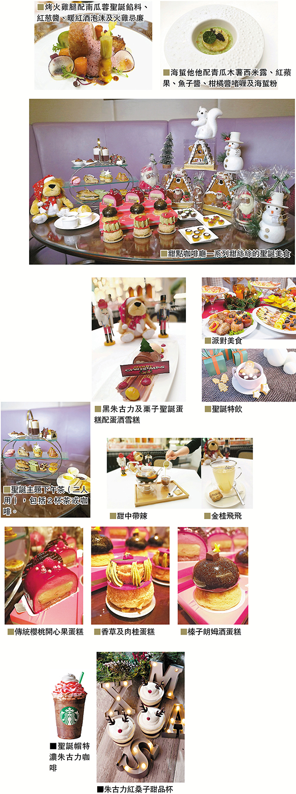 同時,咖啡廳亦推出一系列甜絲絲的聖誕美食,如傳統朱古力蛋糕「Chocolate Buche de Noel」、「傳統櫻桃開心果蛋糕」、「蜜糖薑餅」、「英式水果蛋糕」、「德國聖誕果子麵包」、「栗子士多啤梨撻」、「栗子奧利奧芝士蛋糕」等。