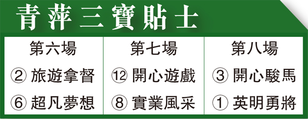 第七場、第三班、一六五○米。「開心遊戲」上季於田草千四交出兩W,然而今季跑過五仗,老蔡最近卻集中火力魒旬韞X擊,先在前仗谷草千二追入大冷第四;上仗再報此程,用何澤堯沿途慳位追入冷位,今次老蔡唔報三班千二卻揀一哩增程出擊,又改配田泰安上陣冷味盎然,值得一敲。
