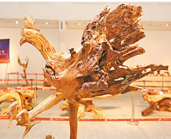 在湖北省襄陽市古玩城日前舉辦的崖柏藝術展上,一個「金雞獨立」造型的崖柏藝術品吸引了許多觀眾圍觀。據作品收藏家劉紅軍先生介紹,這尊藝術品除了雞頭和左爪做了輕微加工外,其餘部位都是天然形成的,其原料樹木出自於湖北興山縣的懸崖絕壁,它所形成的「金雞獨立」充滿了大自然的靈氣。 ■文/圖:視覺中國