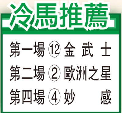 第一場、第四班、一六五○米。「金武士」與「綠勇士」及「田黃」等駒同父,在澳洲服役時已屬目前馬主名下並由名帥賀嘉時訓練,在當地四戰得一冠一殿,贏馬途程在千二米,上季來港插三班起步連輸十一場,踏入今季初出五班千二米即後上爆冷開齋;之後回升四班連輸四場,但每次後上俱有姍姍來遲之感,今次加程首次跑一哩正合目前腳法,提防在此一網打盡。