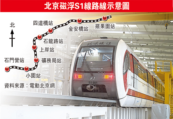 據介紹,S1線是北京市首條磁浮線,西起門頭溝區石門營站,東至石景山區蘋果園站,通車後將有效改善首都西部地區居民的交通出行條件。磁浮列車時速約100公里,不僅具有傳統軌道交通系統的優點,更凸顯了磁浮交通安全可靠性高、轉彎半徑小、爬坡能力強、噪聲低等優勢。