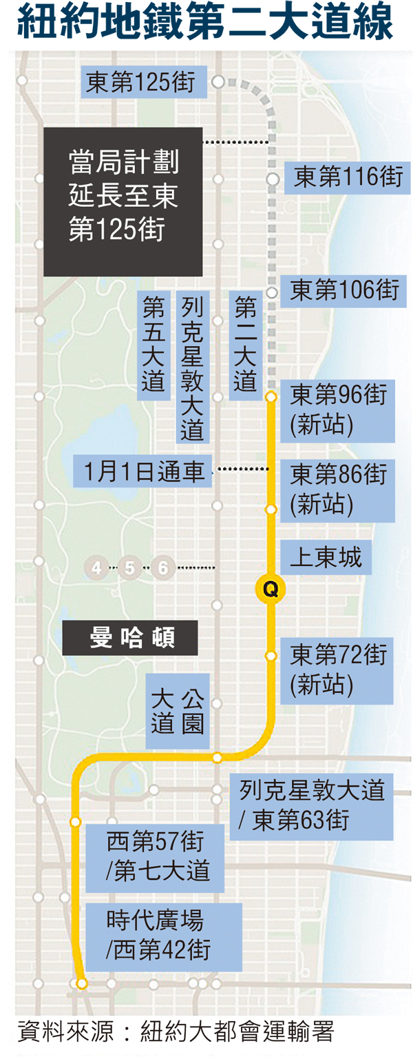 當局早於1929年已構思興建第二大道線,但工程因預算問題多番停頓,輾轉花了近70年才建成,耗資45億美元(約349億港元)。新線長3.2公里,沿曼哈頓上東城的第二大道行駛,分別在第96街、第86街及第72街交界設有車站,並在列克星敦大道及第63街接駁其他路線。當局預計,新線每天能接載約20萬名乘客,有助紓緩目前擠迫的地鐵網絡。