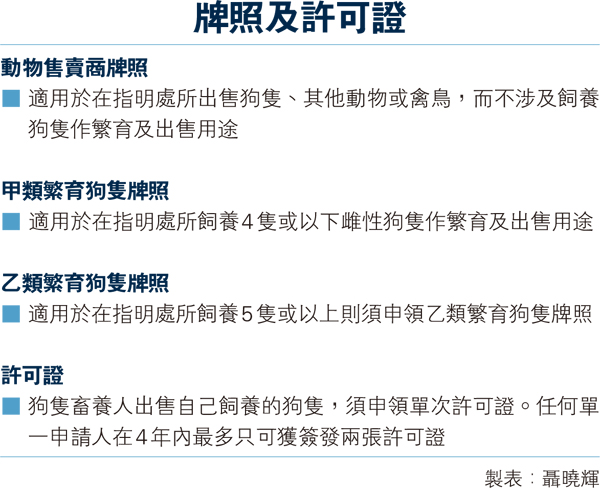 發言人指出,新規例生效後,出售狗隻者必須領有適當牌照或許可證。規例下三類牌照:動物售賣商牌照、甲類繁育狗隻牌照、乙類繁育狗隻牌照和單次許可證。牌照或許可證持有人不得出售狗隻予未滿16歲的人。