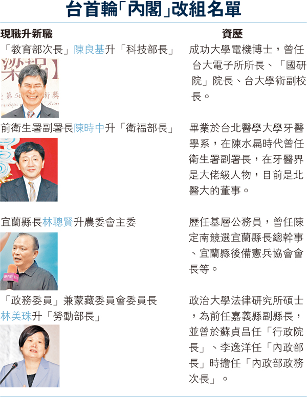 「行政院」3日晚上召開緊急新聞發佈會,宣佈首波「內閣」改組名單,「科技部長」由「教育部次長」陳良基接任,前衛生署副署長陳時中將接掌「衛福部長」、宜蘭縣長林聰賢出任農委會主委,現任「政務委員」兼蒙藏委員會委員長、同時也是蔡英文表姊的林美珠則被派任為「勞動部長」。