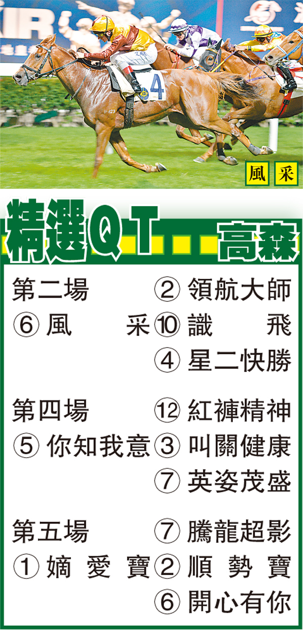 第二場、第四班、一六五○米。「風采」(圖4號)同程錄得三勝三位佳績,剛戰沿途居後,入直路前不少後上馬已提早發力,但其鞍上人卻未見進取,最終姍姍來遲得第五,如今次做好留放,定能提升名次。「識飛」今季兩勝五班賽,於四班仍能上名,居此亦具爭勝能力,三甲之材。