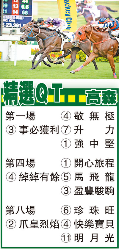 第四場、第四班、一六五○米。「綽綽有餘」踏入季中狀態跑起,近兩戰能夠於田草千六及谷草一哩兩個不同路程取得連捷,今仗乘勇列陣對手非強,料可締造三連霸佳績。「馬飛龍」剛役同程再度交出上名成績得第三,本身跑法可前置又可後追,以今場少領放馬形勢,若跟前競跑賺形勢,是有贏馬機會。