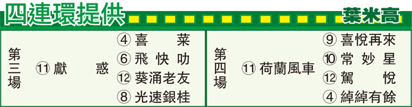 第三場、第四班、一二○○米。告東尼馬房「獻惑」,父親「街頭口號」曾勝出杜拜世界盃,轉作種馬後亦成績斐然,子嗣包括日蝕大獎得主「街頭觸覺」、美國馬后「信雅達」等等,過往在港同父馬如「金鑾殿」、「續領風騷」及「博愛福星」陣上演出甚佳。「獻惑」季內四度上陣走勢山雨欲來,今次轉場縮程估計正合其發揮,有權施放冷箭。