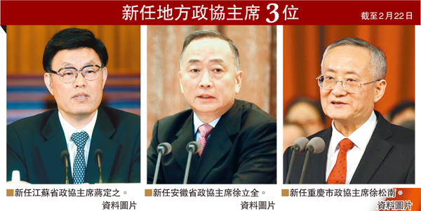 省級地方「兩會」陸續落下帷幕,有關人事調整備受矚目。本刊梳理發現,截至目前,僅有海南省因「兩會」正在召開中,暫未公開人事變動外,其餘已閉幕的省級地方「兩會」均有人事調整。其中,安徽、重慶、江蘇三省市都迎來了新的政協主席,各省市政協都有政協副主席履新。48個新當選的省級政協副主席主要來自於換屆後退出省委常委班子的「老常委」、省級政府副職、地市的黨政一把手,其中有李士祥、孫瑞彬、王建明等28人是換屆後退出省委常委班子的「老常委」。■香港文匯報·人民政協專刊記者 凱雷、任芳頡 北京報道